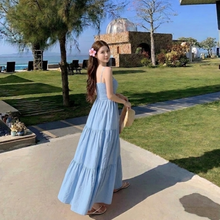 쁘띠엘라 휴양지 원피스 스모크밴딩 A라인 발목기장 빅사이즈 비치웨어