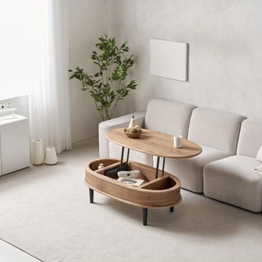 국내제조 듀얼리프트기계 빠른출고 템바보드 타원형 거실리프트업테이블, 뿔다리 우드
